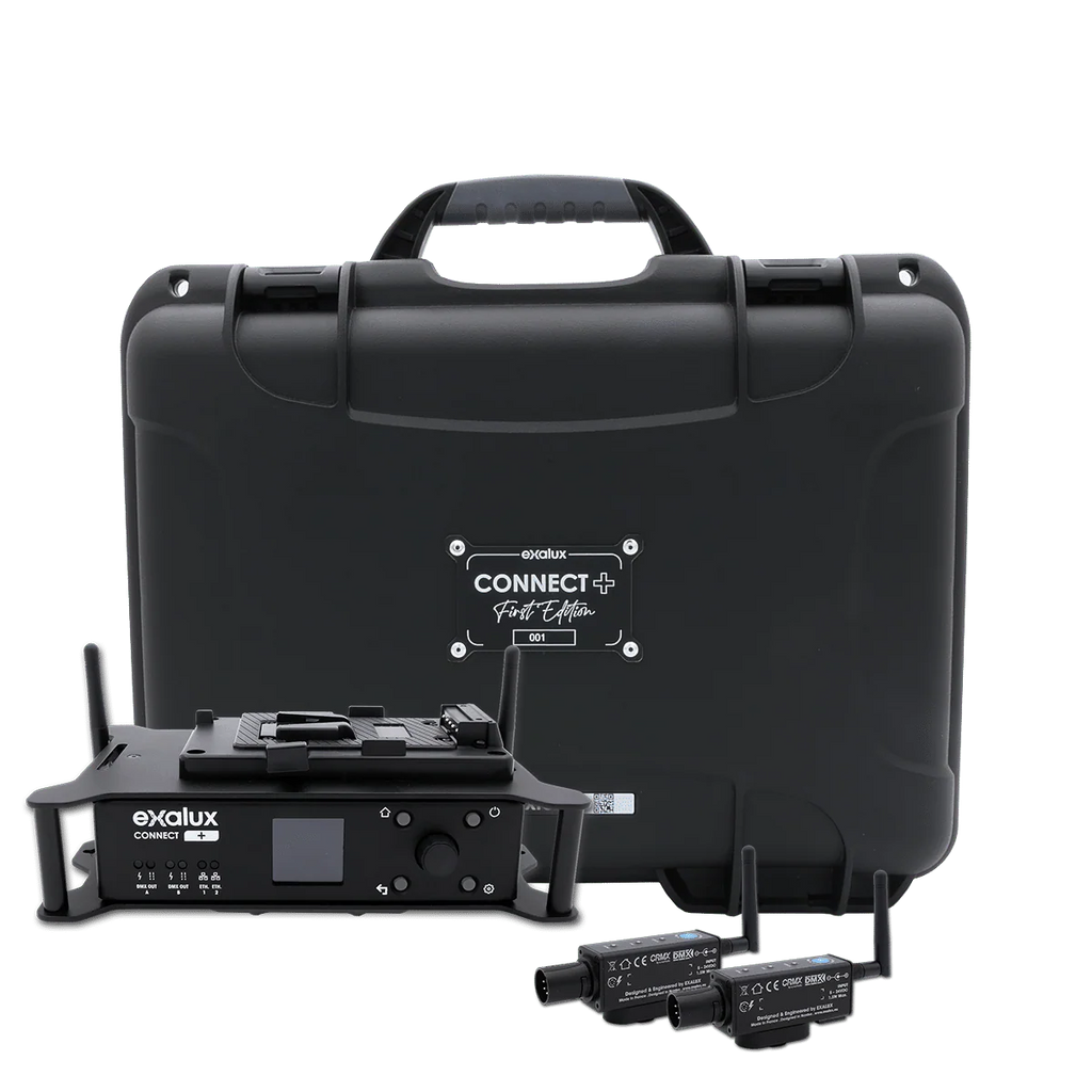 Includes - CONNECT+ LIGHTING CONTROLLER - X2 1M BLACK XLR5 CABLE MALE TO XLR5 FEMALE - INTERNATIONAL PLUG-IN POWER SUPPLY + SOCKETS - EXALUX PLASTIC CASE WITH MACHINED FOAM